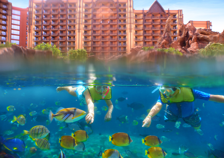 At Aulani, A Disney Resort & Spa in Ko Olina, Hawai’I, Cardmembers receive 10% off adult and child passes when using a Disney Visa Card or Disney Rewards Redemption Card to rent snorkel sets at Makiki Joe’s.16 Your rental gives you access to the Guest-exclusive saltwater lagoon Rainbow Reef—with 3,800 square feet full of marine life and hidden undersea artworks to explore.
