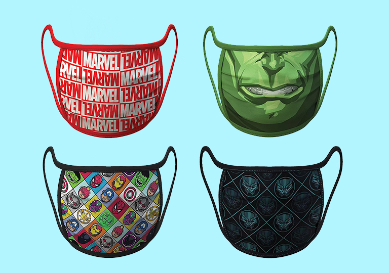From left to right: Marvel Logo Mask, Hulk Mask, Marvel Multicharacter Mask, Black Panther Mask
