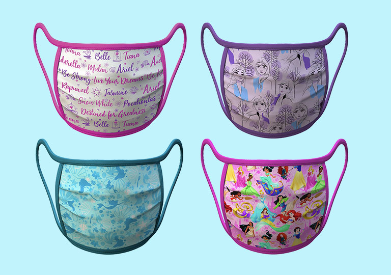 From left to right: Princess Names Mask, Purple Frozen Mask, Aqua Princess Mask, Princess Print Mask