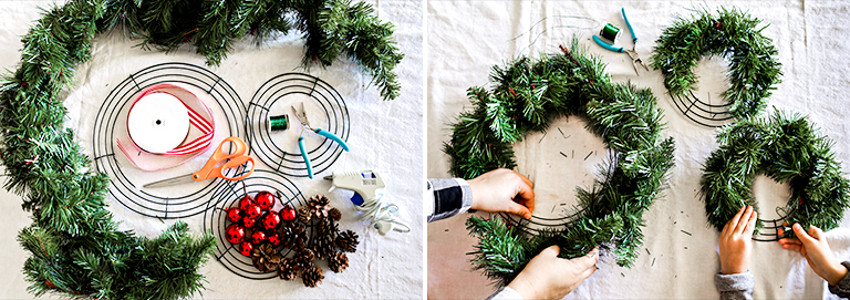 1. To create the ears, wrap green garland around the smaller wreath forms and secure with floral wire. Hot glue any extra bits of greenery as needed for filler. Repeat with the larger form for the head.