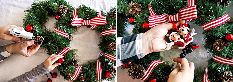 3. Hang the Mickey and Minnie ornament from the center of the wreath and secure with wire.