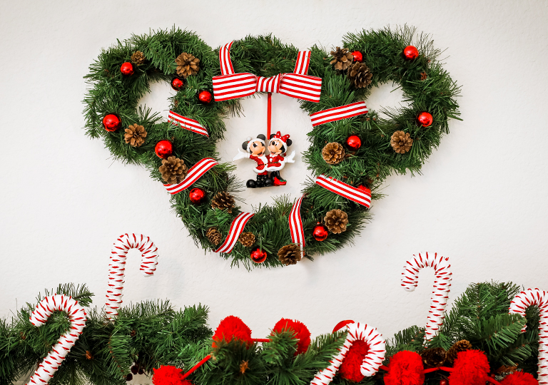 This candy-striped creation starring everyone’s favorite duo, Mickey and Minnie, looks great hanging above a fireplace, on a door or anywhere you want to add a touch of festivity.