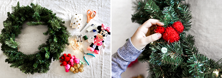 1. Once Mickey ears are dry, add a drop of craft glue and have your kiddo help push them into the wreath greenery. Repeat with smaller pom poms.