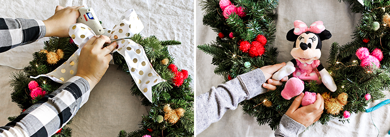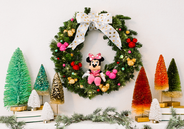 For a colorful and cuddly holiday display, we put together this wreath with plush pal Minnie. The polka dot bow and twinkle lights add a sweet seasonal shimmer, while the glittering pom poms and Minnie plush make it appealing. Plus, they’re an easy addition that allows your little ones to join in.