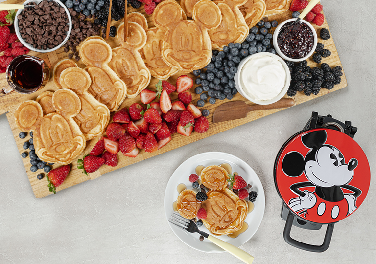 The only thing better than waffles: Mickey Mouse-shaped waffles, a staple of Disney parks breakfasts! Craft these creations in your own kitchen using the Mickey Mouse Waffle Maker. Use your favorite waffle recipe, then assemble a scrumptious board with all the fixings: syrup, honey, sprinkling sugar, chocolate chips, all kinds of berries, whipped cream, jam, butter or any other toppings or sides you can find! Simply style your board with the waffles along the center, add small cups or ramekins for the toppings, and scatter the berries to fill in the rest of the space and provide a colorful flourish.