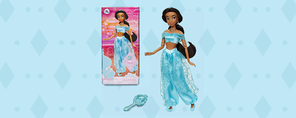 2. Jasmine Classic Doll—With her sparkling blue ensemble, regal jewelry and mini hairbrush, this Jasmine doll will get imaginations soaring to whole new worlds.