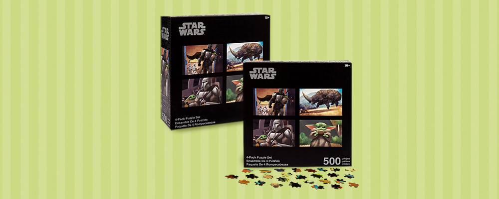 Get your crew ready for family game night with this set of four 500-piece puzzles inspired by The Mandalorian.