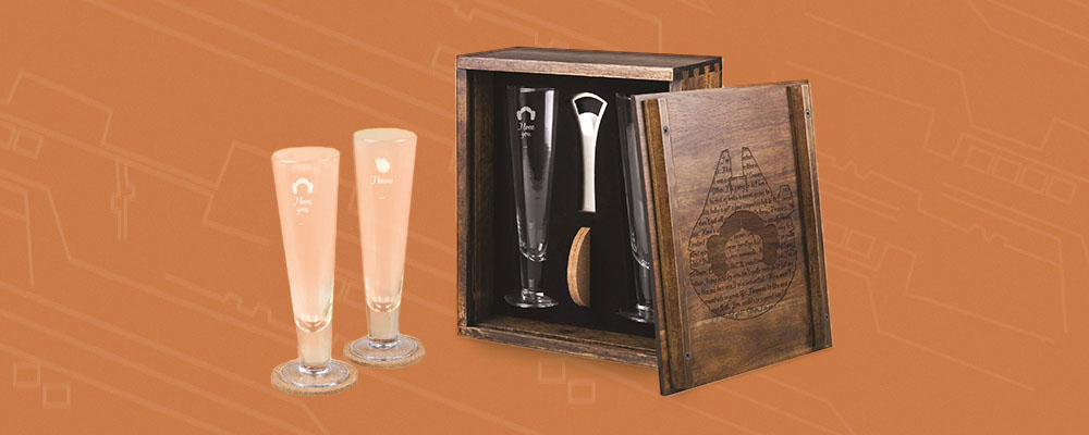 Star Wars couples from every edge of the galaxy will love this Han Solo and Princess Leia beverage gift! Underneath the sliding front panel of the engraved wood box sits two fluted glasses, cork coasters and a bottle opener.