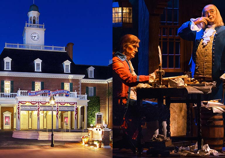 American Adventure, the host nation of World Showcase, features a multi-media theatrical journey through key historical moments utilizing audio-animatronic® figures and a 28-feet-tall by 155-feet-wide projection screen—the largest ever built.