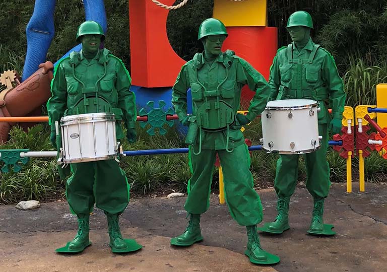 Keep your eyes and ears open for the Green Army Drum Corps in Toy Story Land. This band is ready to break their poses and entertain Guests of all ages with high-energy drum sequences.