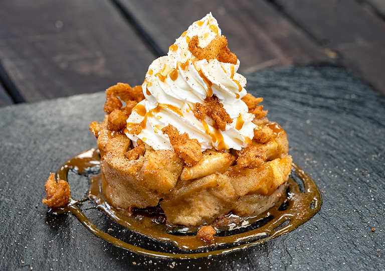 Walk to the wharf for a wholesome holiday offering that smells as good as it tastes! This warm apple cinnamon bread pudding is served with top-notch toppings: whipped cream, warm salted caramel sauce, cinnamon, sugar and funnel cake crumble.