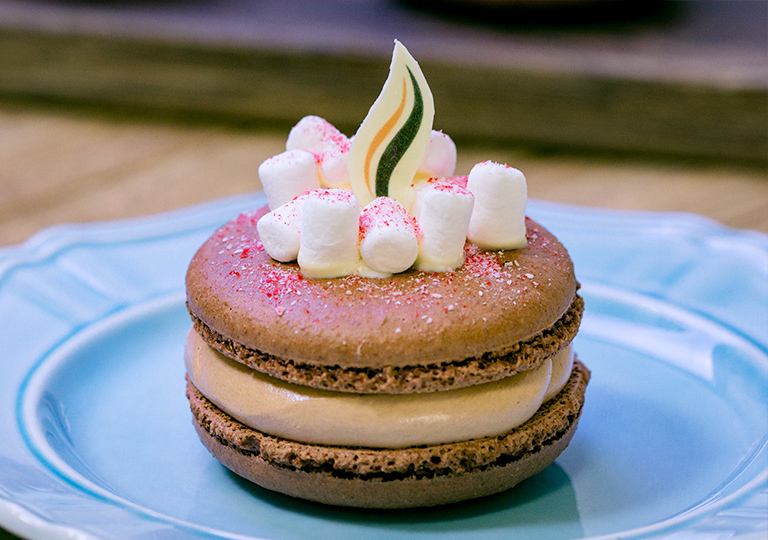 You don’t need a mug to enjoy the taste of this timeless holiday beverage in dessert form. Sink your teeth into a chocolate almond macaron shell filled with hot cocoa-flavored cream and chocolate ganache. Bottoms up!