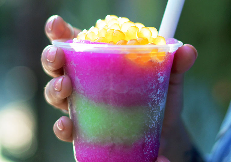 If you love to walk on the wild side at Disney’s Animal Kingdom® Theme Park, you’ve got to taste the Night Blossom. A colorful beverage served at breakfast, lunch and dinner, it comes in eye-catching hues of lime green and brilliant magenta, topped with passionfruit popping pearls. This out-of-this-world treat bursts with apple and desert pear limeade flavors, and you can get it at Pongu Pongu, located in Pandora – The World of Avatar.
