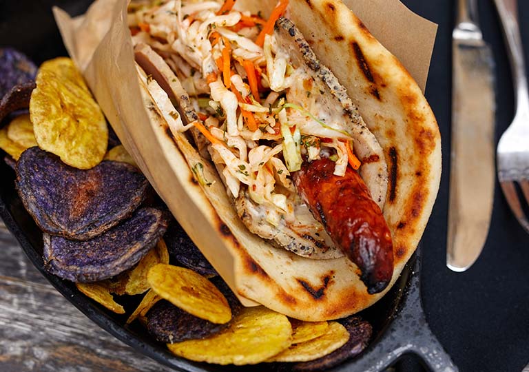 While exploring Star Wars: Galaxy’s Edge, follow the mouthwatering aroma of grilled meat right Ronto Roasters. Here, you can find the delicious Ronto Wrap, featuring roasted pork, grilled pork sausage, peppercorn sauce and tangy slaw, rolled into a pita. It’s hearty and delicious—one bite will transport you to the heart of Tatooine!