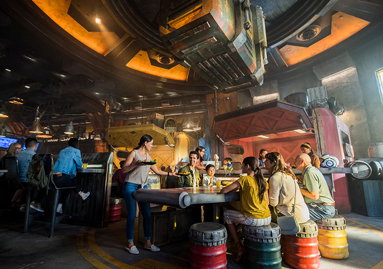 Crew members of all ages can enjoy fantastical drinks like Blue Bantha and Jabba Juice at this watering hole in Star Wars: Galaxy’s Edge®. Oga’s Tip: You can make reservations up to 60 days in advance. Check availability using the My Disney Experience app* or the Disneyland app.*