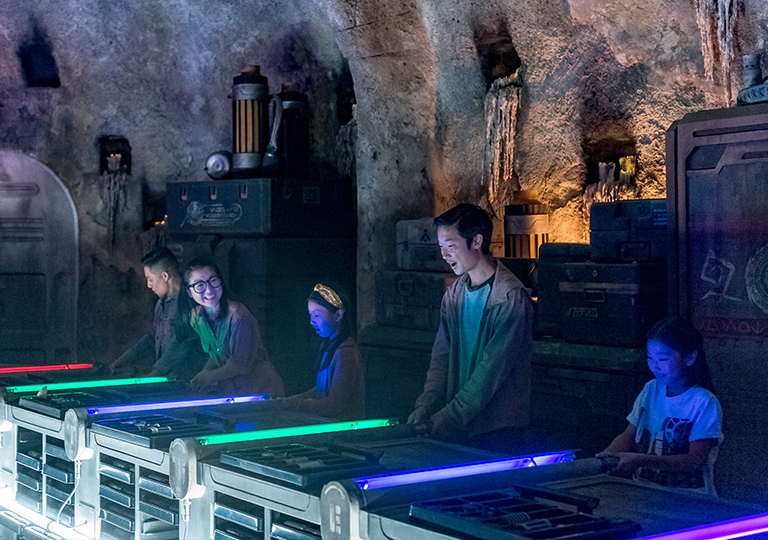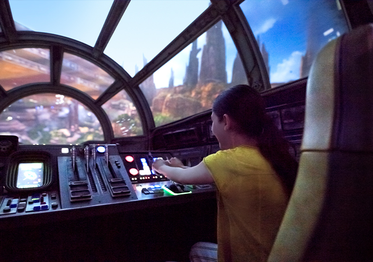 Step into the cockpit of the Millennium Falcon in Star Wars: Galaxy’s Edge® and receive your role: pilot, engineer or gunner. Then, take your assignment and blast off, flying this famous starship on an interactive smuggling mission. Want to practice while you wait to board? Download the Play Disney Parks app* to take on a job and help get the Falcon ready for your flight.