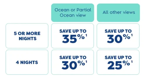 Subject to availability as the number of rooms allocated for this offer is limited. Not valid on Suites and 3-Bedroom Grand Villas. Cannot use in combination with any other discount or promotion and not valid on previously booked rooms or villas.