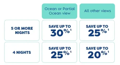 Cardmembers, use your Disney® Visa® Card and save up to 30% for stays of 5 or more nights on select travel dates for ocean or partial ocean view rooms at AULANI, A Disney Resort & Spa, or save 25% on stays of 4 nights, for most nights from January 4 – April 9, 2026.1
