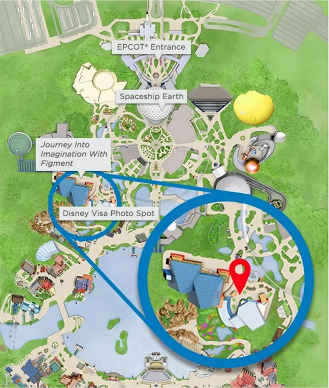 WHERE The private Cardmember location at the Disney Visa Photo Spot at EPCOT® in World Celebration next to Journey Into Imagination With Figment.
